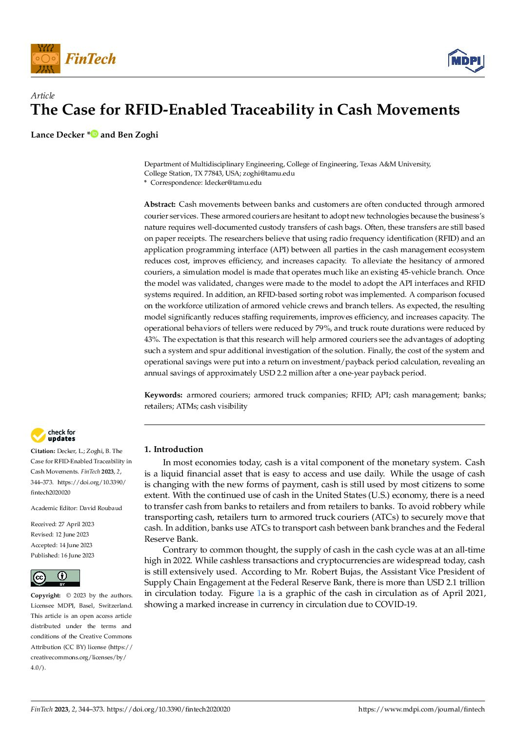 The traditional cash management process involving armored couriers has been transformed through the integration of RFID technology and API interfaces. Researchers have developed a simulation model mimicking existing branch operations to demonstrate the efficiency gains and cost reductions achievable with this innovative approach. By implementing RFID systems and API interfaces, along with an RFID-based sorting robot, significant improvements in efficiency and capacity have been achieved, with reduced staffing requirements and shorter truck route durations. The findings suggest substantial operational savings, with an estimated annual savings of approximately USD 2.2 million, highlighting the potential for widespread adoption of this system within the cash management ecosystem.