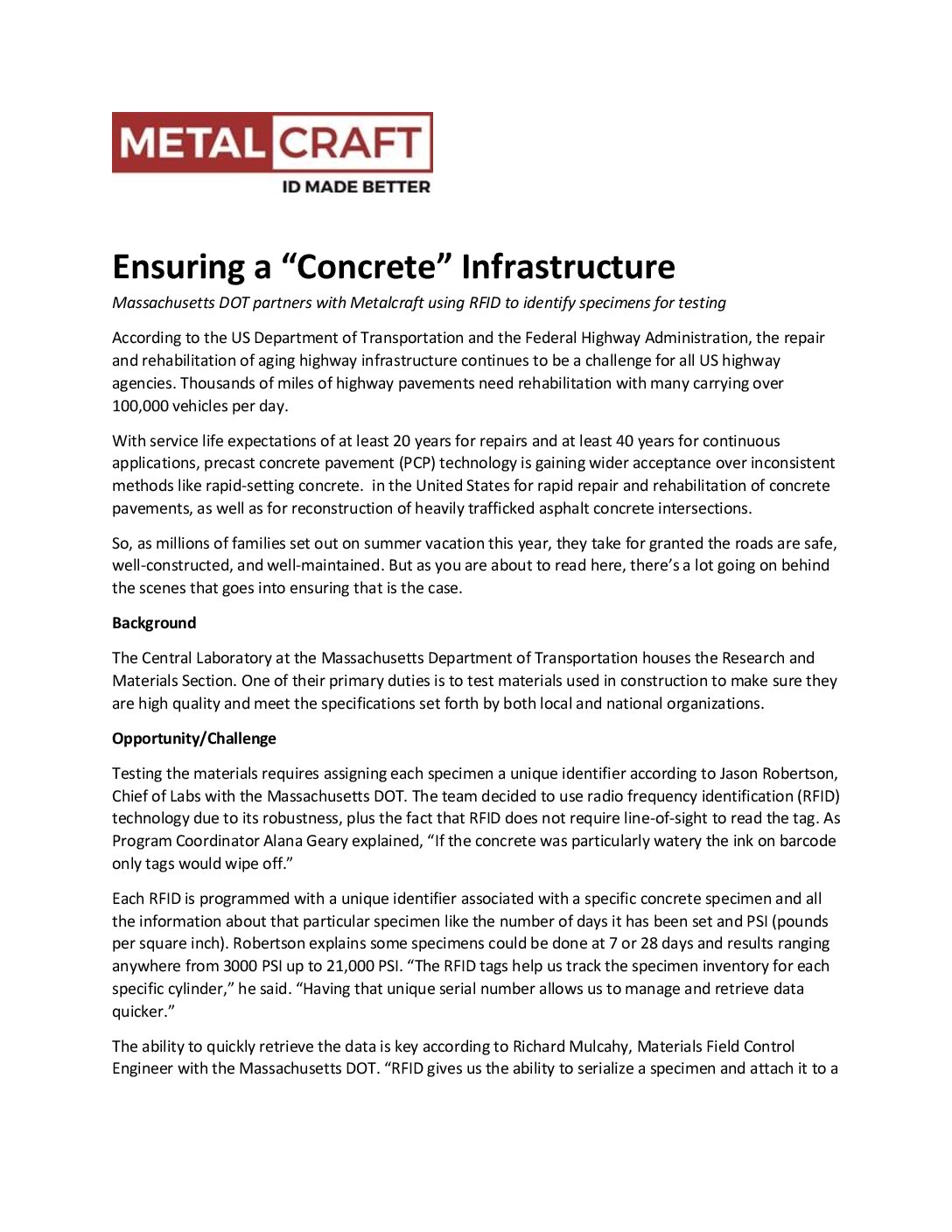 The Massachusetts Department of Transportation (MA DOT) faced the challenge of uniquely identifying concrete specimens to ensure quality and compliance with regulations. To address this, they adopted radio frequency identification (RFID) technology for its robustness and ability to read tags without line of sight. Metalcraft’s recommendation of the 3.8″ round RFID Flex Hard Tag, known for its durability and IP68 rating, proved instrumental in tracking concrete specimens effectively. The project has seen success in accurately identifying unique specimens and managing pertinent information, showcasing the efficacy of RFID technology in enhancing quality control processes.