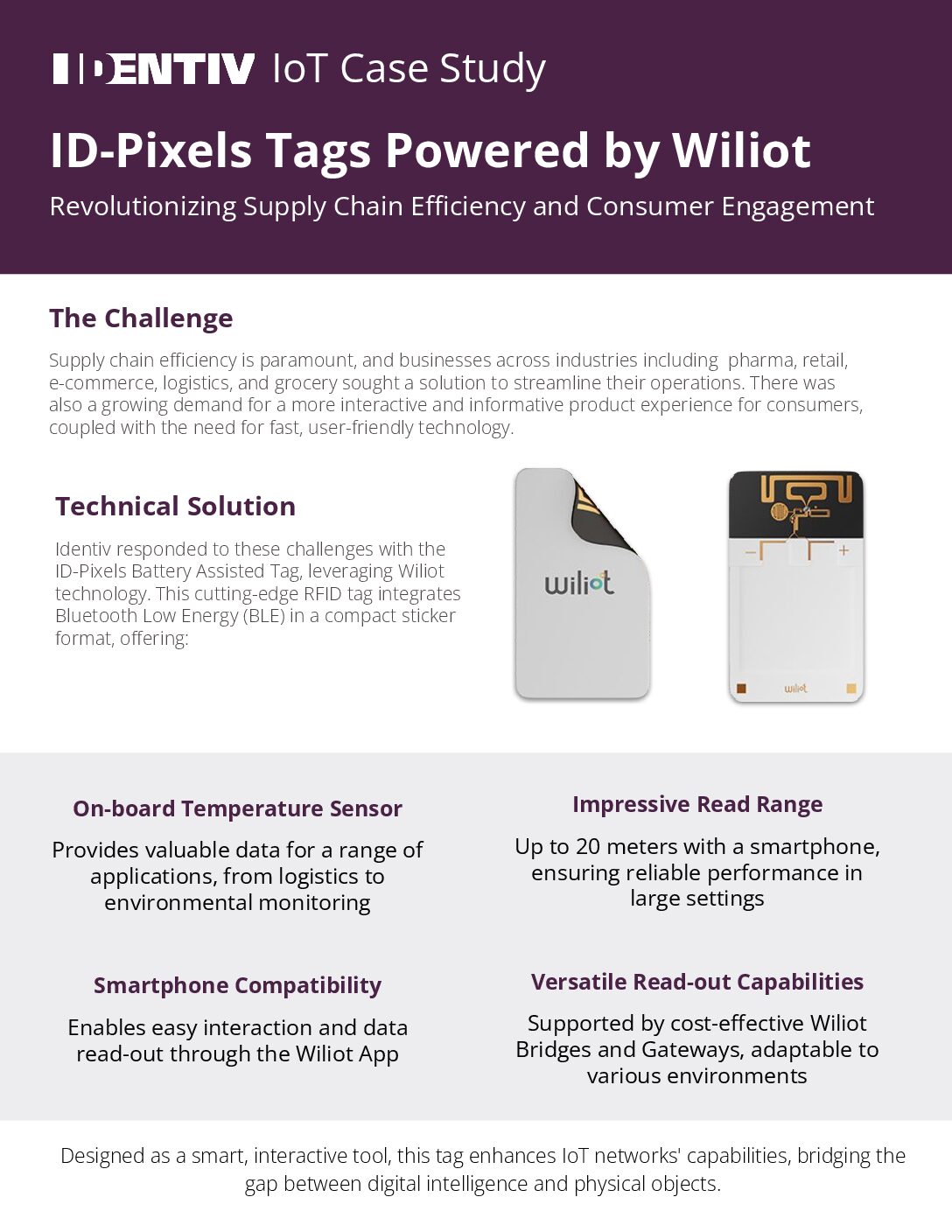 Various industries, from pharma to retail, were grappling with supply chain complexities and the need for improved consumer engagement. In response, the Identiv IoT ID-Pixels Battery Assisted Tag, powered by Wiliot technology, was introduced. This innovative RFID tag, featuring Bluetooth Low Energy (BLE) technology in a compact sticker format, offers enhanced inventory management, logistics efficiency, and consumer interaction. With onboard temperature sensing, smartphone compatibility, and an impressive read range, it has set a new standard for BLE-enabled RFID tags, revolutionizing operational processes and elevating user experiences across sectors.