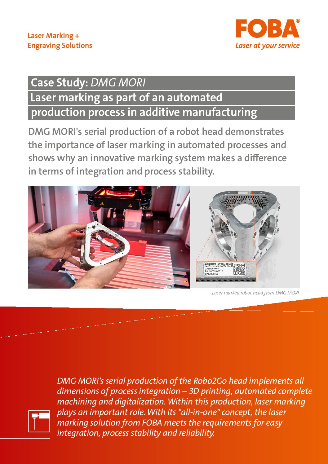 DMG MORI utilizes a comprehensive process chain, starting with 3D printing of robot heads using the LASERTEC 30 DUAL SLM, forming part of the flexible Robo2Go workpiece handling system. Following printing, laser marking ensures reliable identification and traceability throughout the product lifecycle, crucial for automated production. Integrated with the manufacturing execution system TULIP, FOBA’s laser marking solution enables precise, error-free markings, supported by a vision system that compensates for minimal positional shifts during additive manufacturing, ensuring accurate part identification and quality assurance.