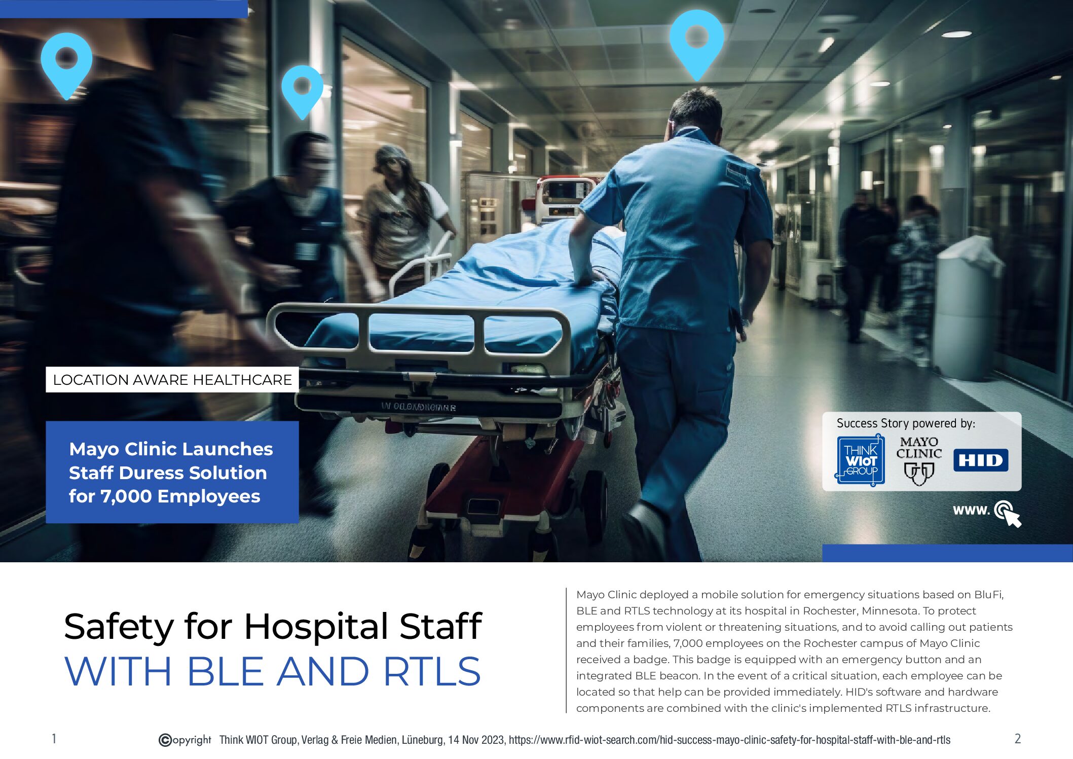 Mayo Clinic addressed the global shortage of nurses and workplace violence in healthcare by deploying a mobile emergency solution using BluFi, BLE, and RTLS technology. Through Staff Duress Badges equipped with emergency buttons and BLE beacons, 7,000 employees at the Rochester campus can trigger alerts in threatening situations. The system, integrated with BluFi BLE antennas and receivers, communicates through a mesh network to accurately locate distressed employees, significantly reducing false alarms and enhancing workplace safety. With 167 emergency calls recorded in 12 months and a notable decrease in false alarms, the project has increased employee safety awareness and set a new standard for healthcare security protocols.